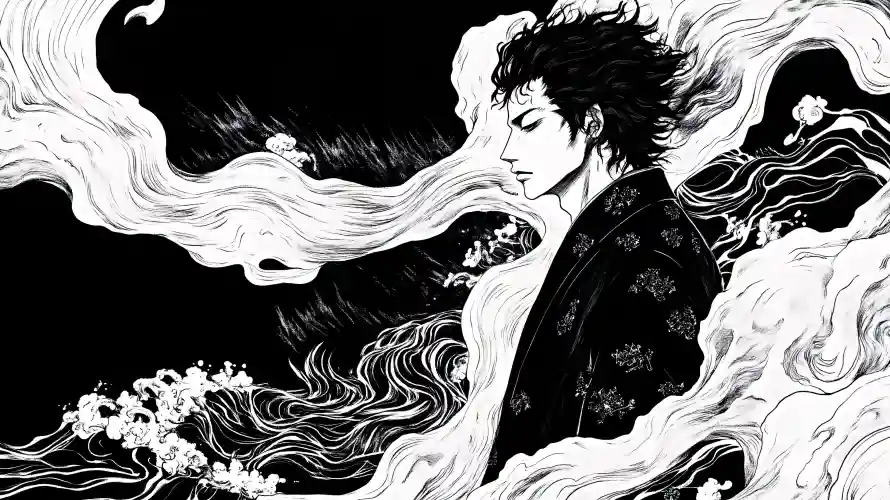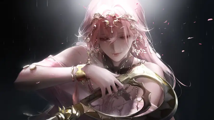 “水墨浪客”,是画师 perseutech 创作的原创武士形象;刃影少女持刃对峙,白发少女探手拂过花影,茉莉抚着武器立于粉金雨幕,暗黑氛围里尽是破碎张力