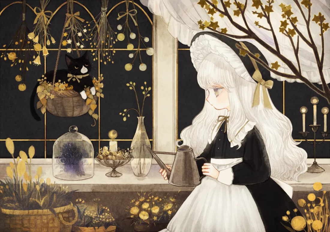 2k(女仆少女壁纸|复古窗台背景图片 - 黑猫相伴)「哲风壁纸」