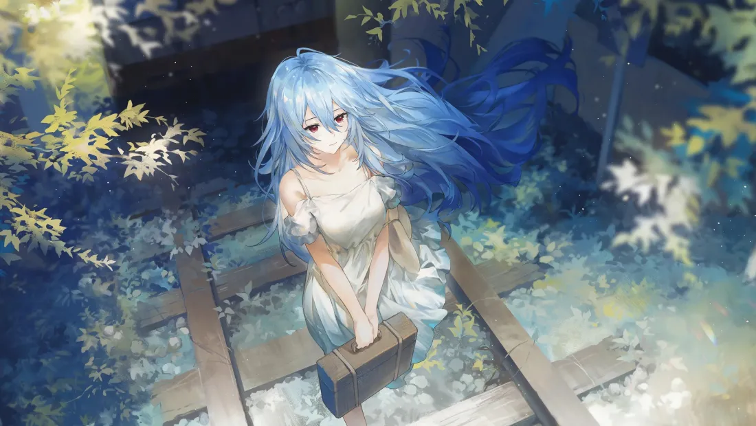 2k蓝发少女壁纸|铁轨森林背景图片 - 动漫插画「哲风壁纸」