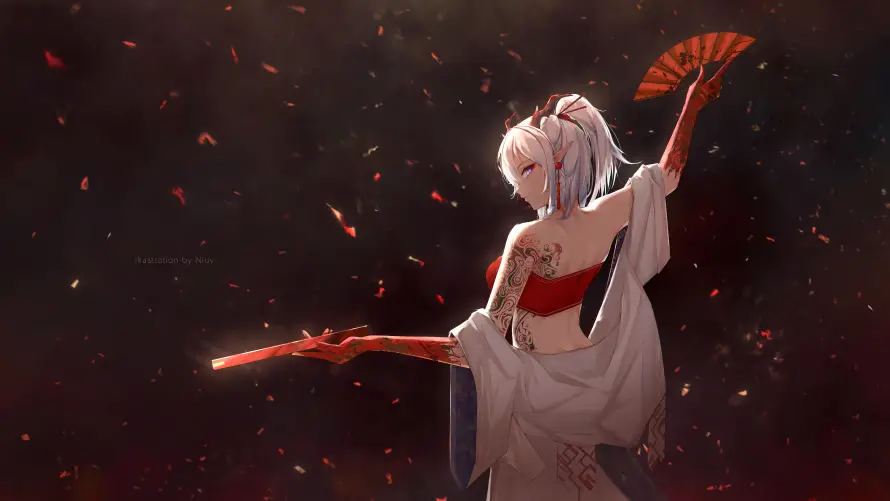 20k和服美女折扇壁纸|星空花瓣背景图片 - 飘逸「哲风壁纸」